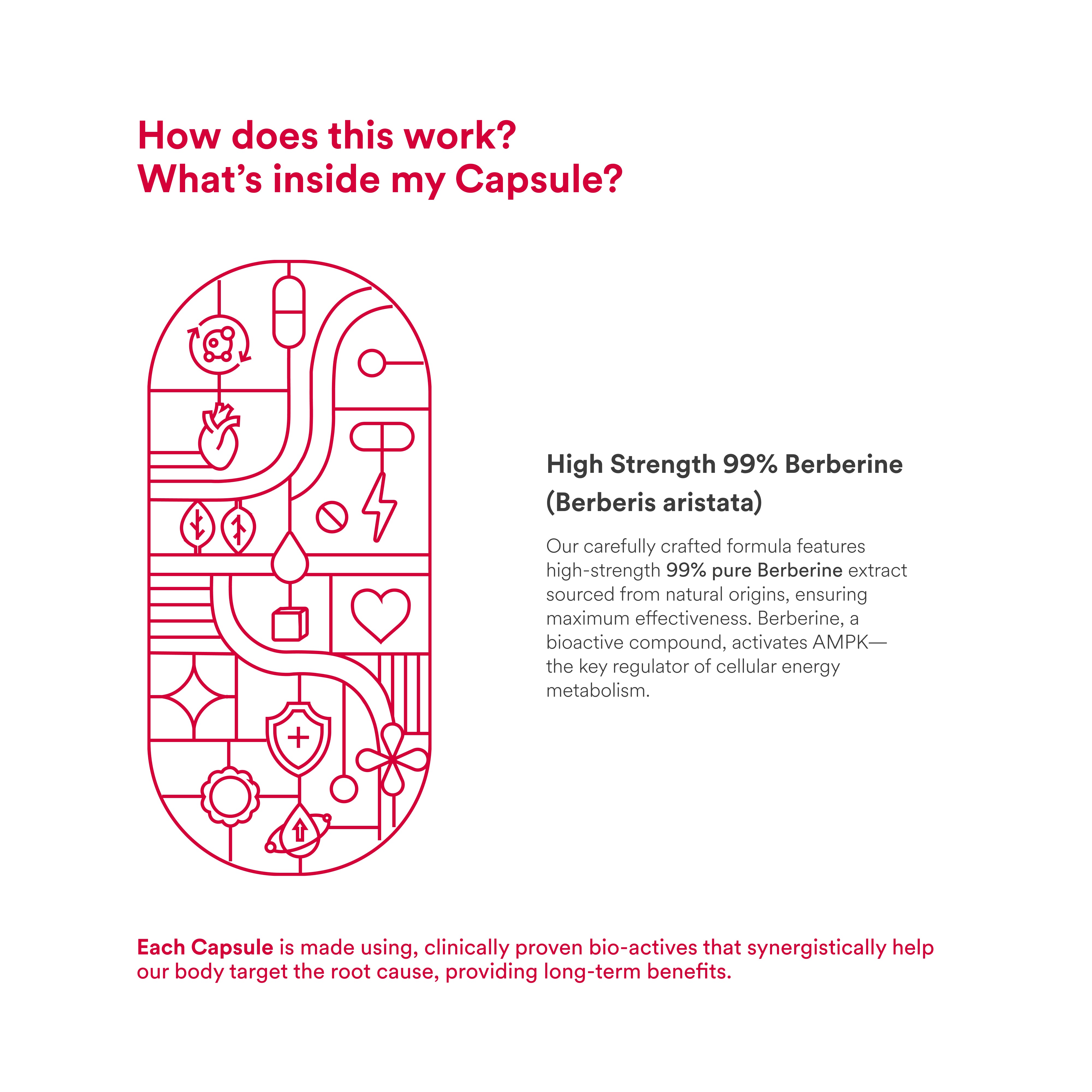 • Berberine activates AMPK enzyme to support cellular energy metabolism, promoting better energy levels and overall vitality.