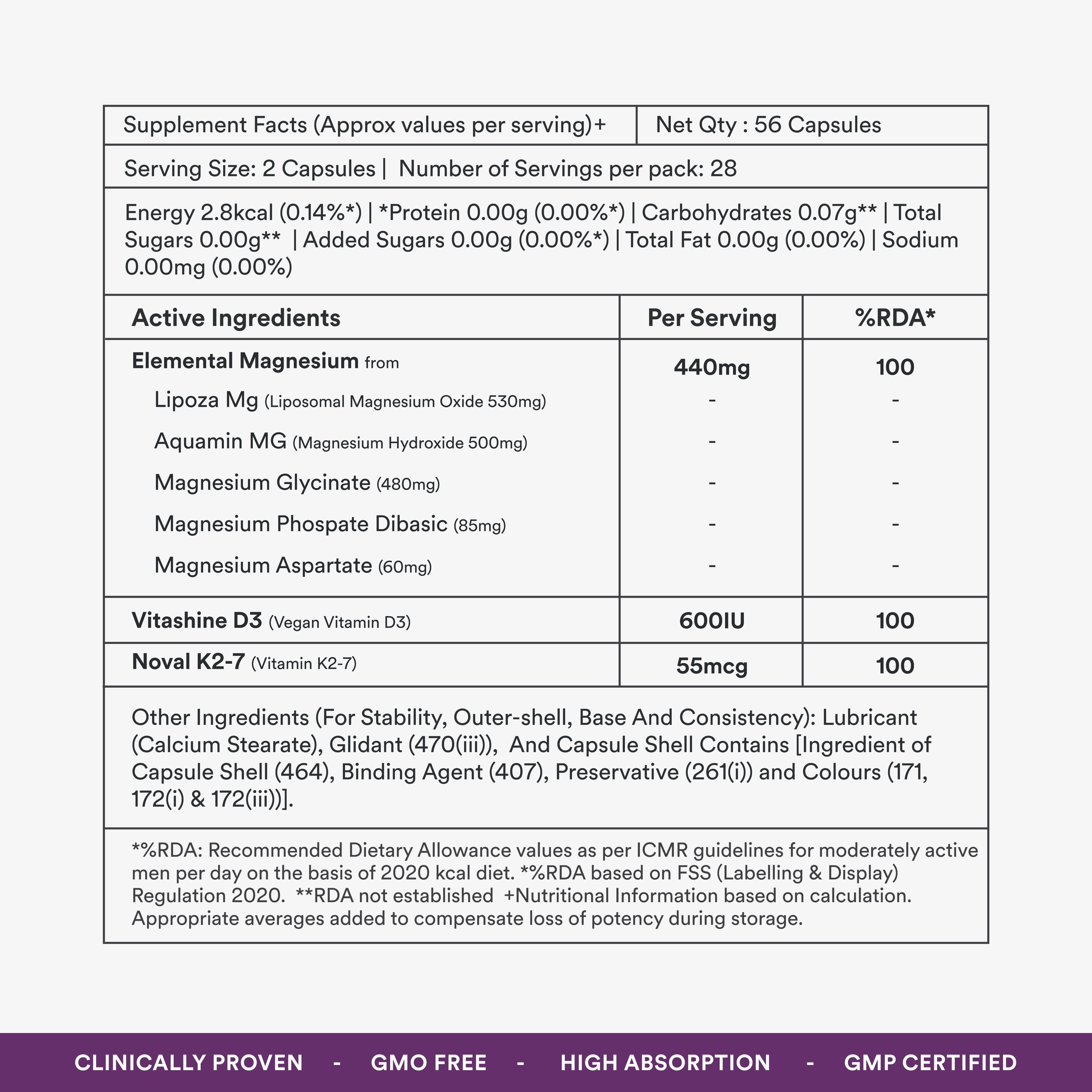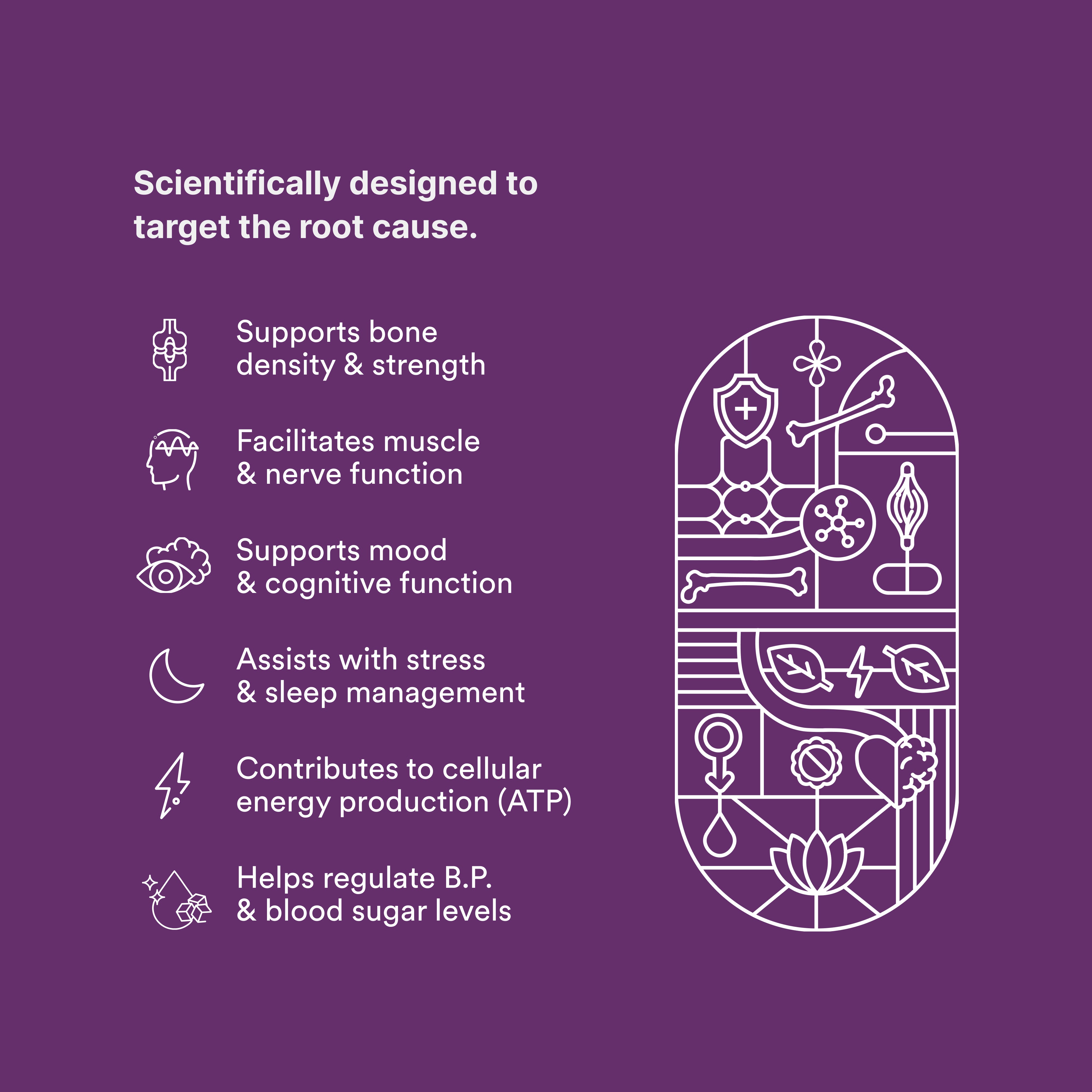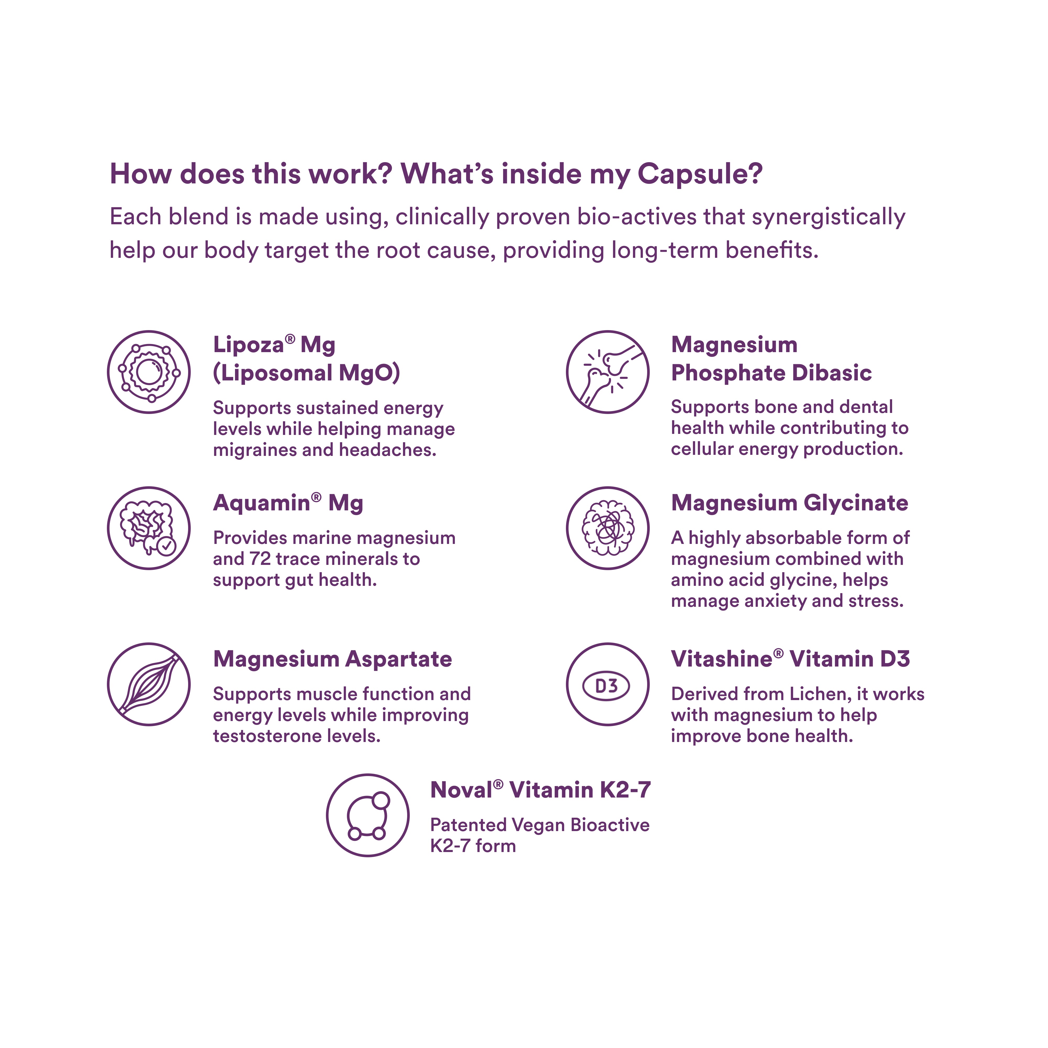 A synergistic blend of five forms of magnesium with vitamin D3 & K2 for higher absorption.