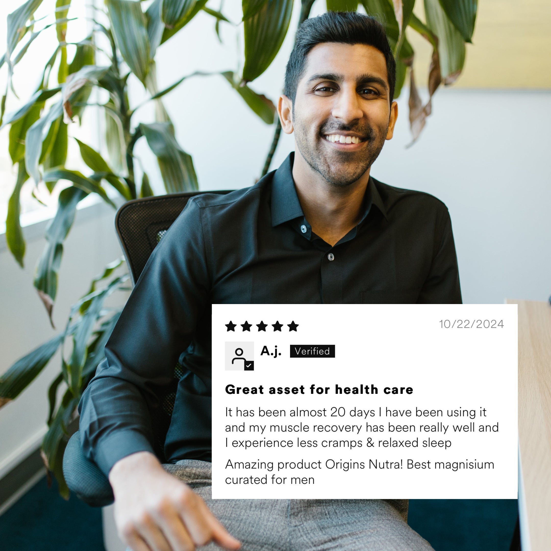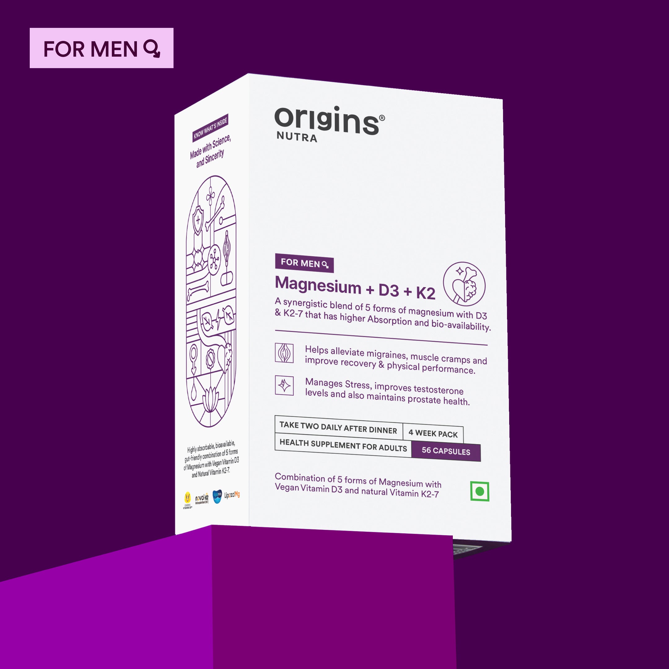 Origins Nutra Magnesium + D3 + K2 supplement for men is specially formulated to support men’s health with a 100% RDA, featuring five different magnesium salts.