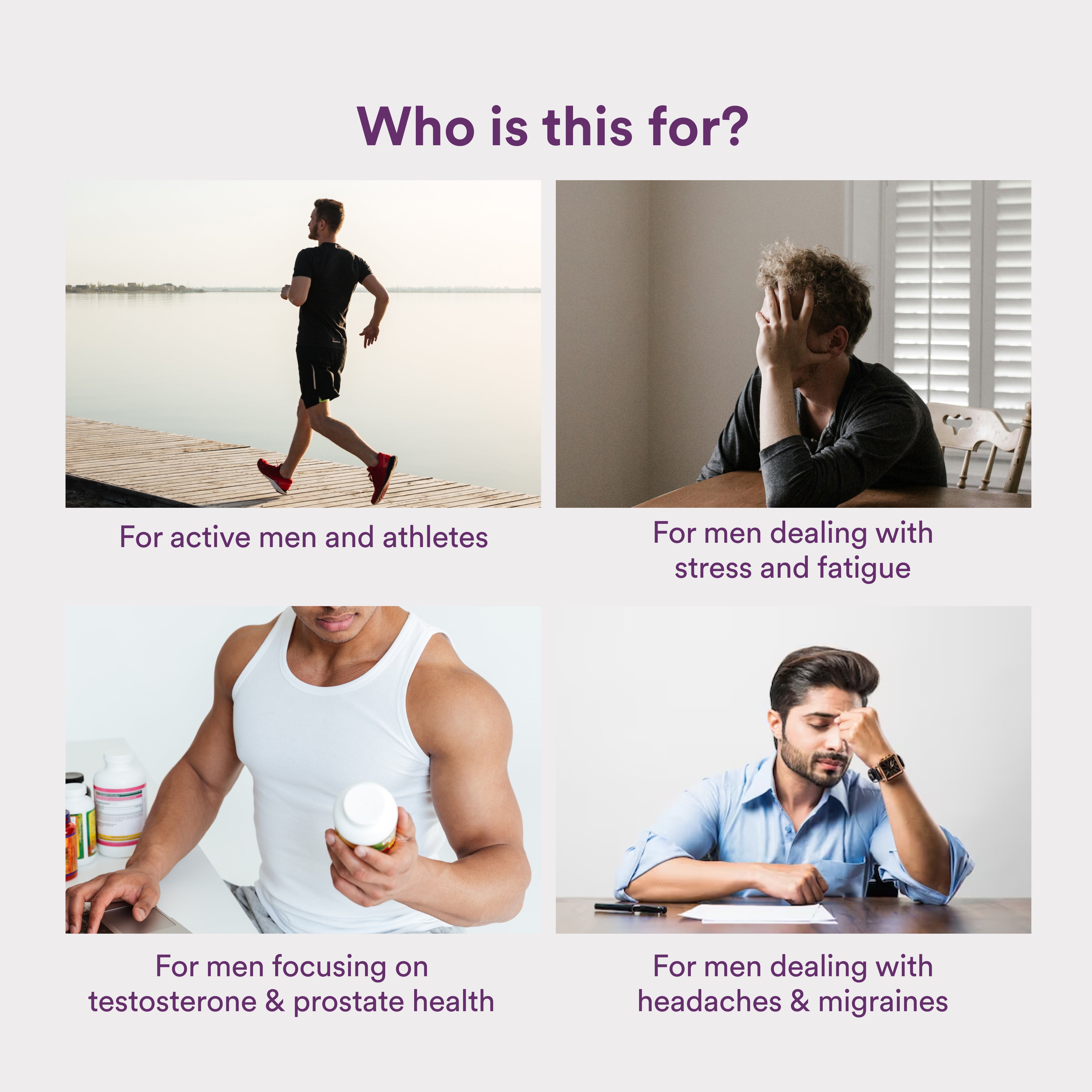 • Supports muscle health, migraines, stress management, and energy levels, promoting overall vitality for men.