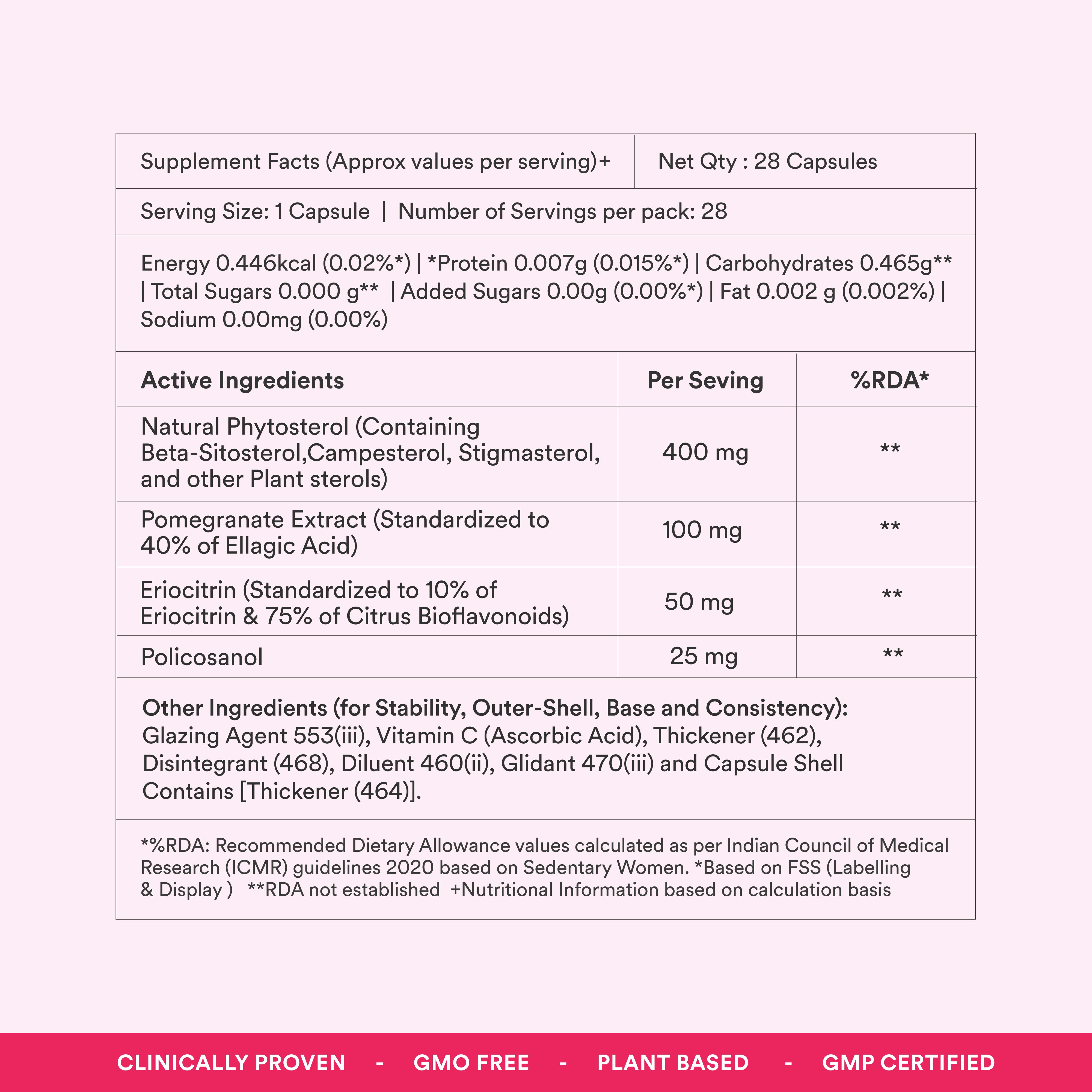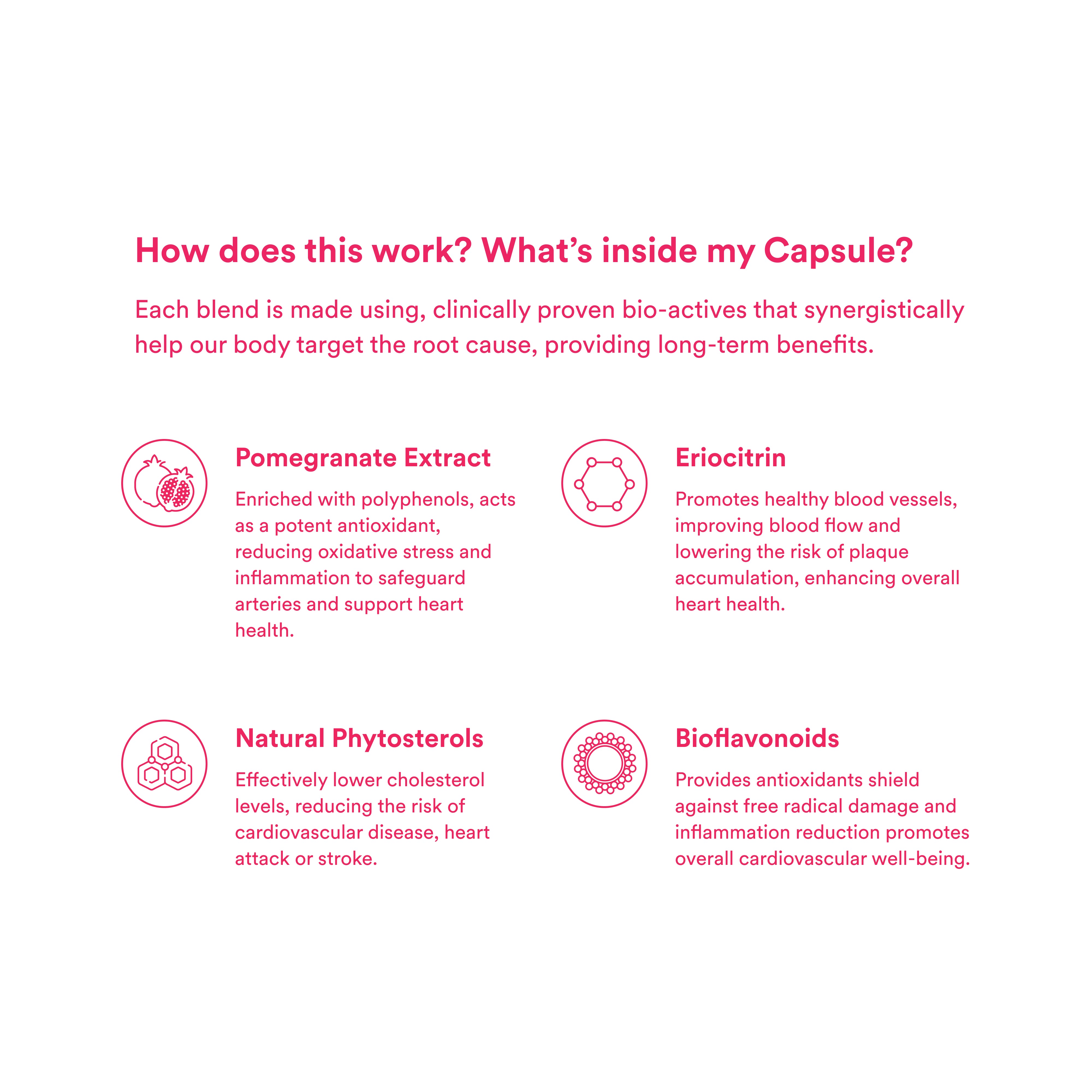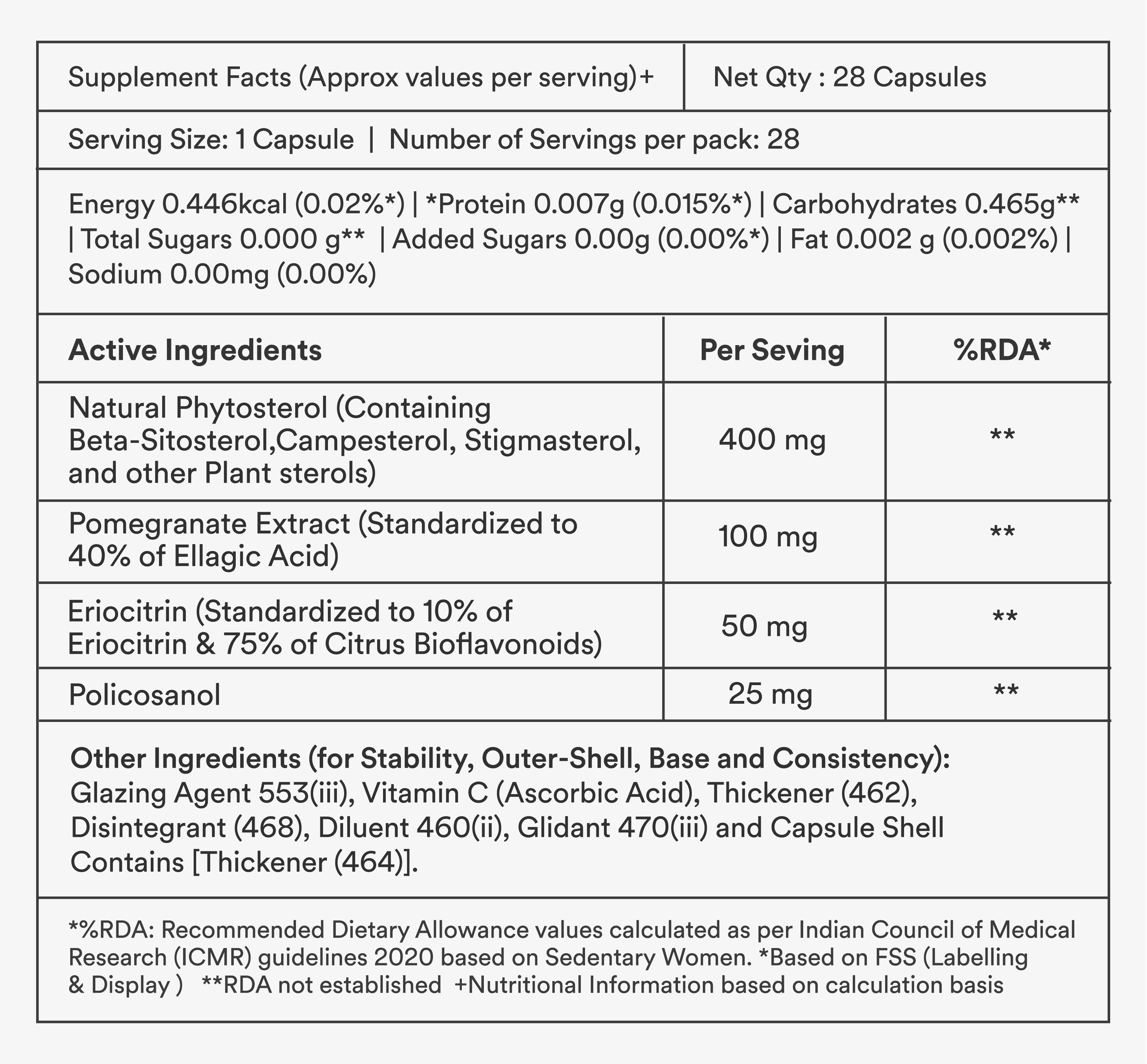 It includes 4 key ingredients—Natural Plant Sterols, Pomegranate Extract, Eriocitrin, and Policosanol—that work together to help manage cholesterol levels and support heart health.