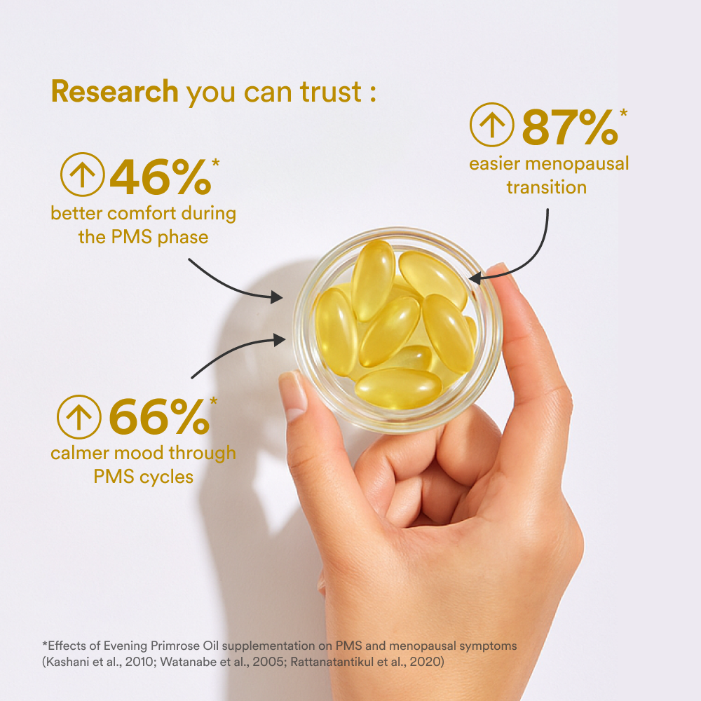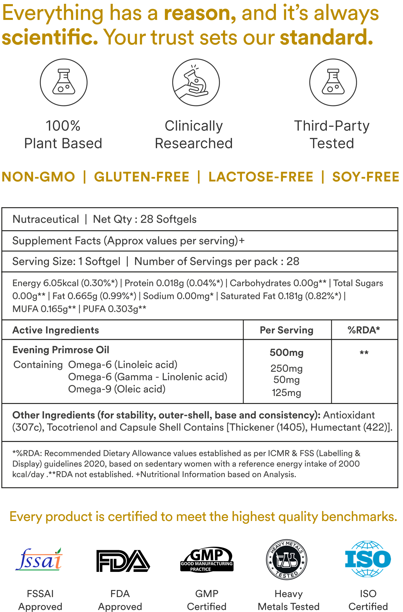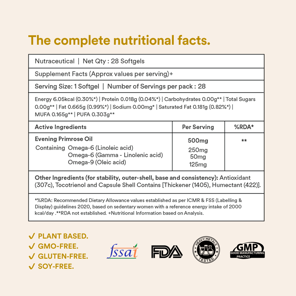 Evening Primrose Oil is a rich source of gamma-linolenic acid (GLA), which helps support hormonal balance, maintain skin health, and contribute to overall wellness.