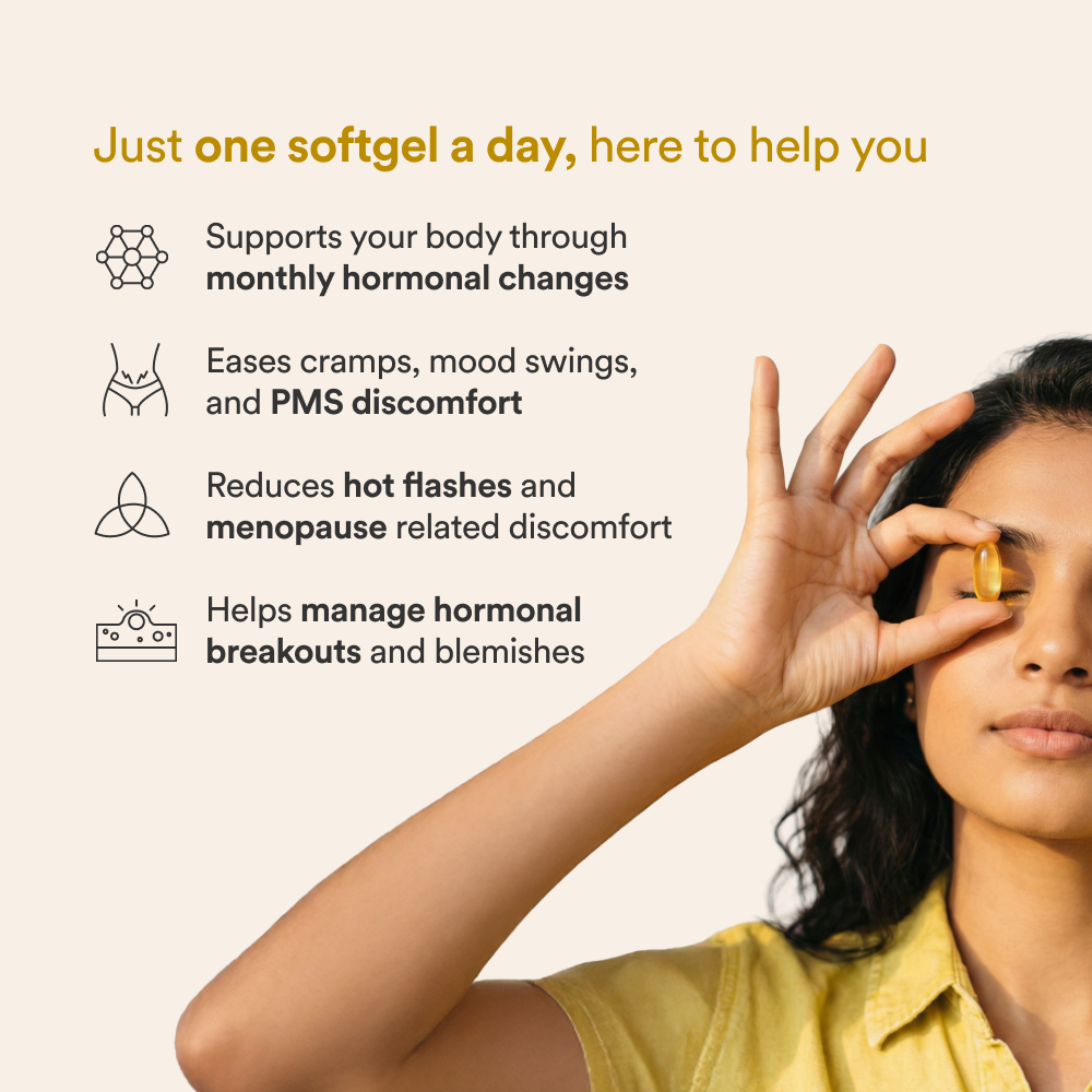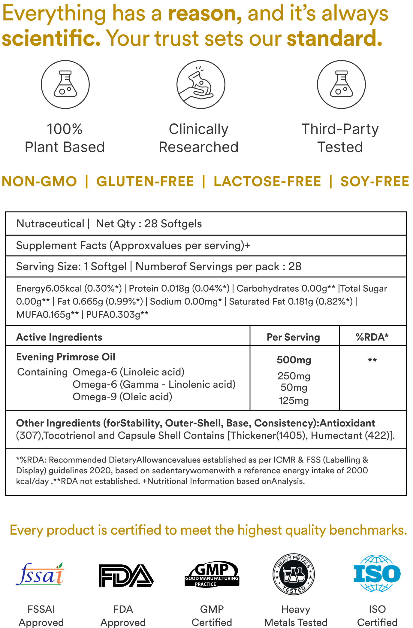 Evening Primrose Oil is a rich source of gamma-linolenic acid (GLA), which helps support hormonal balance, maintain skin health, and contribute to overall wellness.