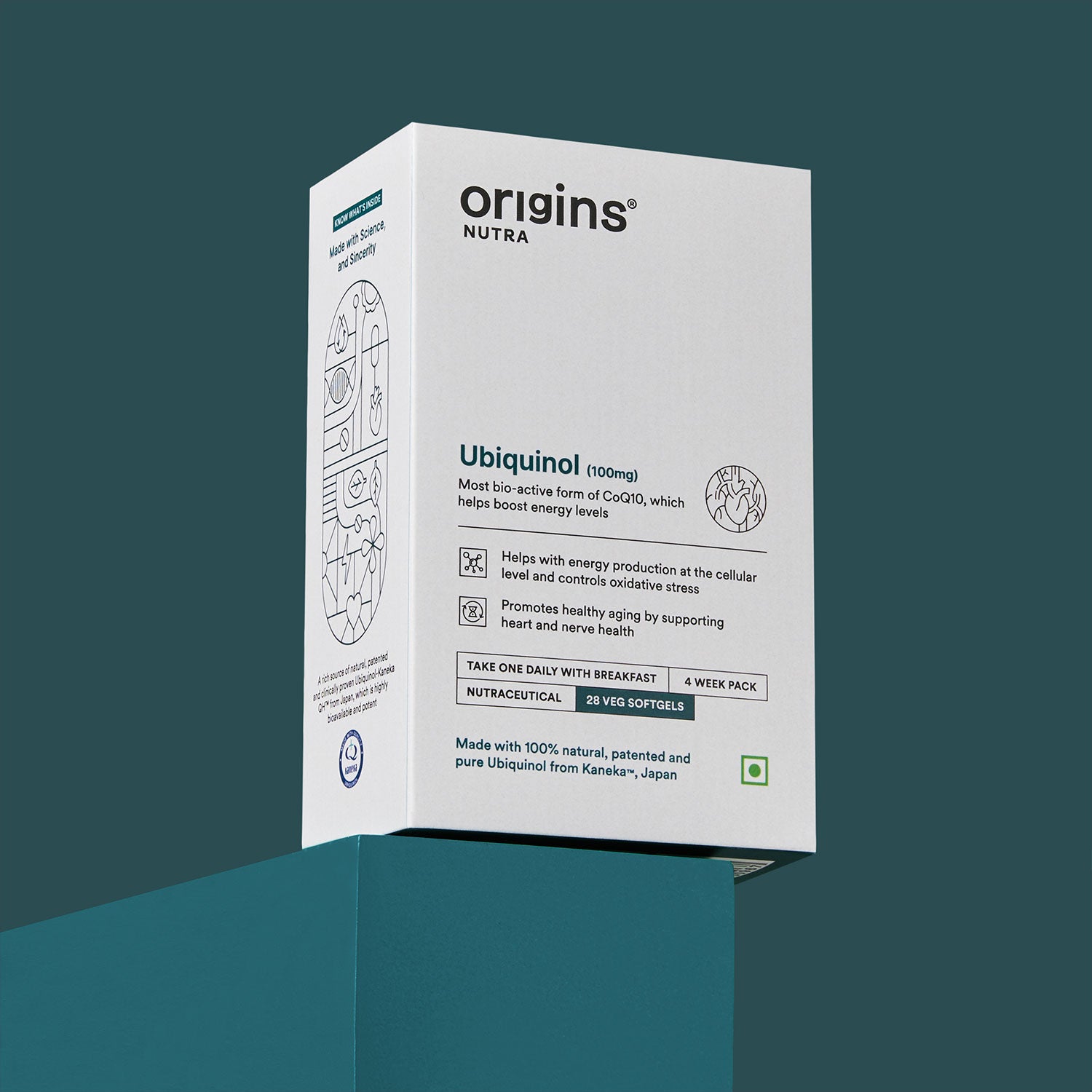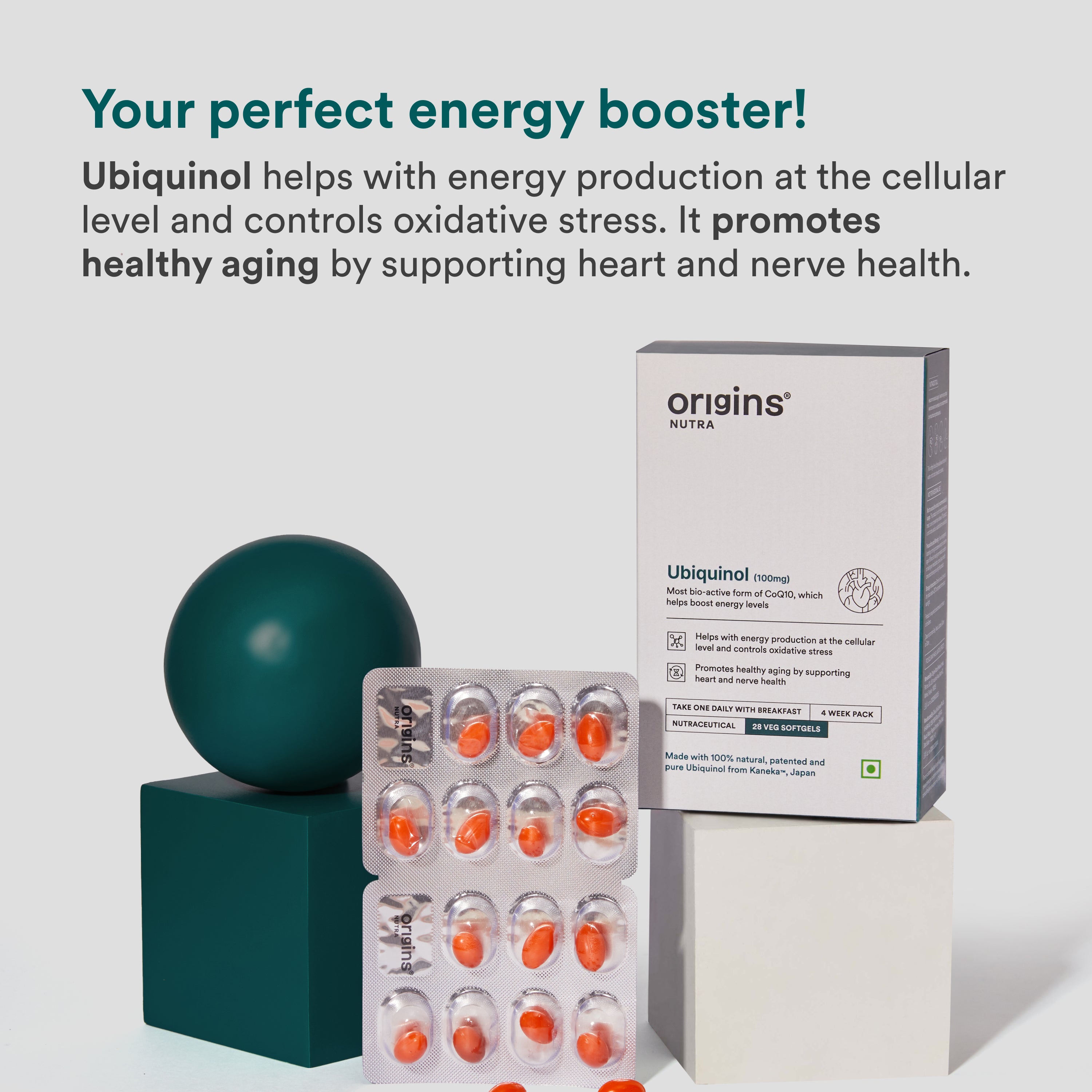 Origins Nutra’s Ubiquinol supplement features premium ubiquinol sourced from Kaneka®, Japan, a trusted name in quality and effectiveness. This potent antioxidant supports healthy aging by enhancing cellular energy production, promoting cardiovascular health, and strengthening cognitive function.