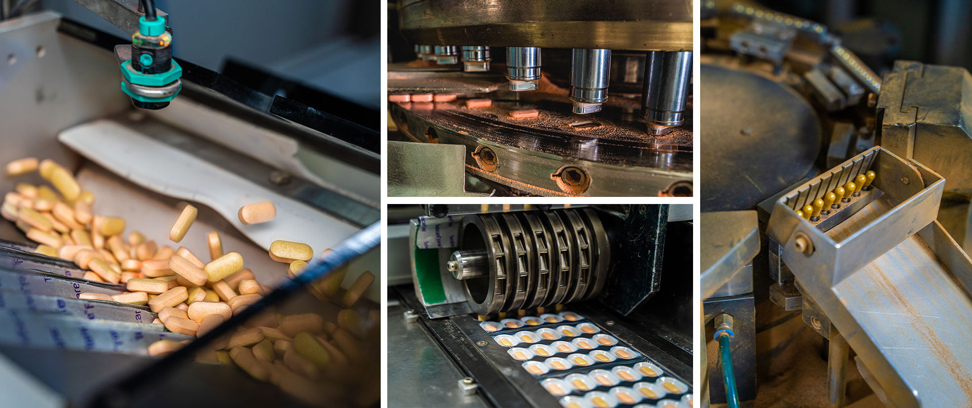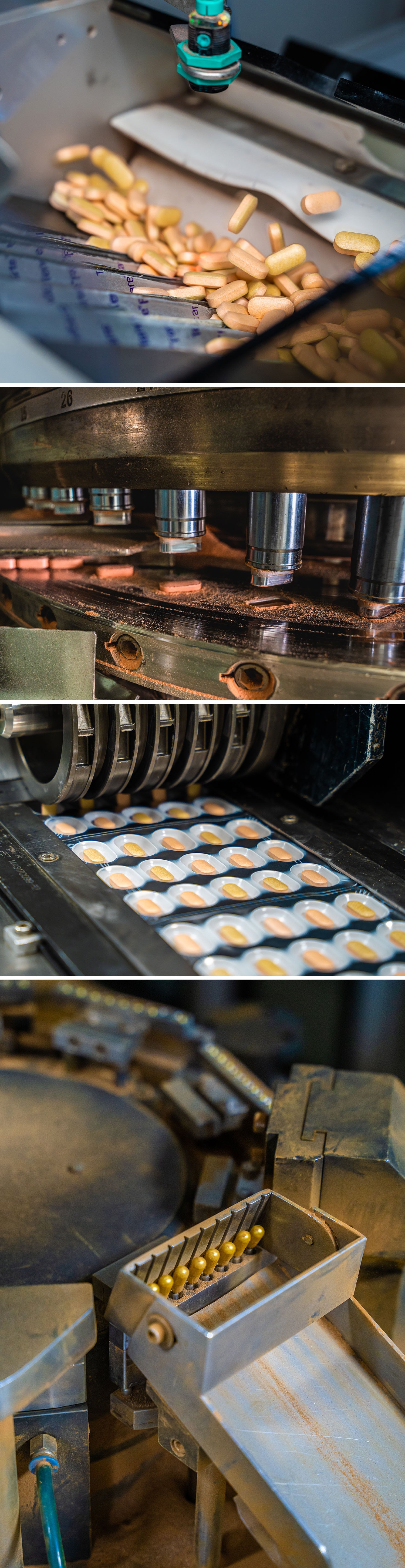 Depending on the final form of the product, active materials are filled, either in a starch-based capsule/softgel. If it's a tablet, the mixture is compressed using pressure to form the shape. These are again tested for consistency, hardness, strength and efficacy.