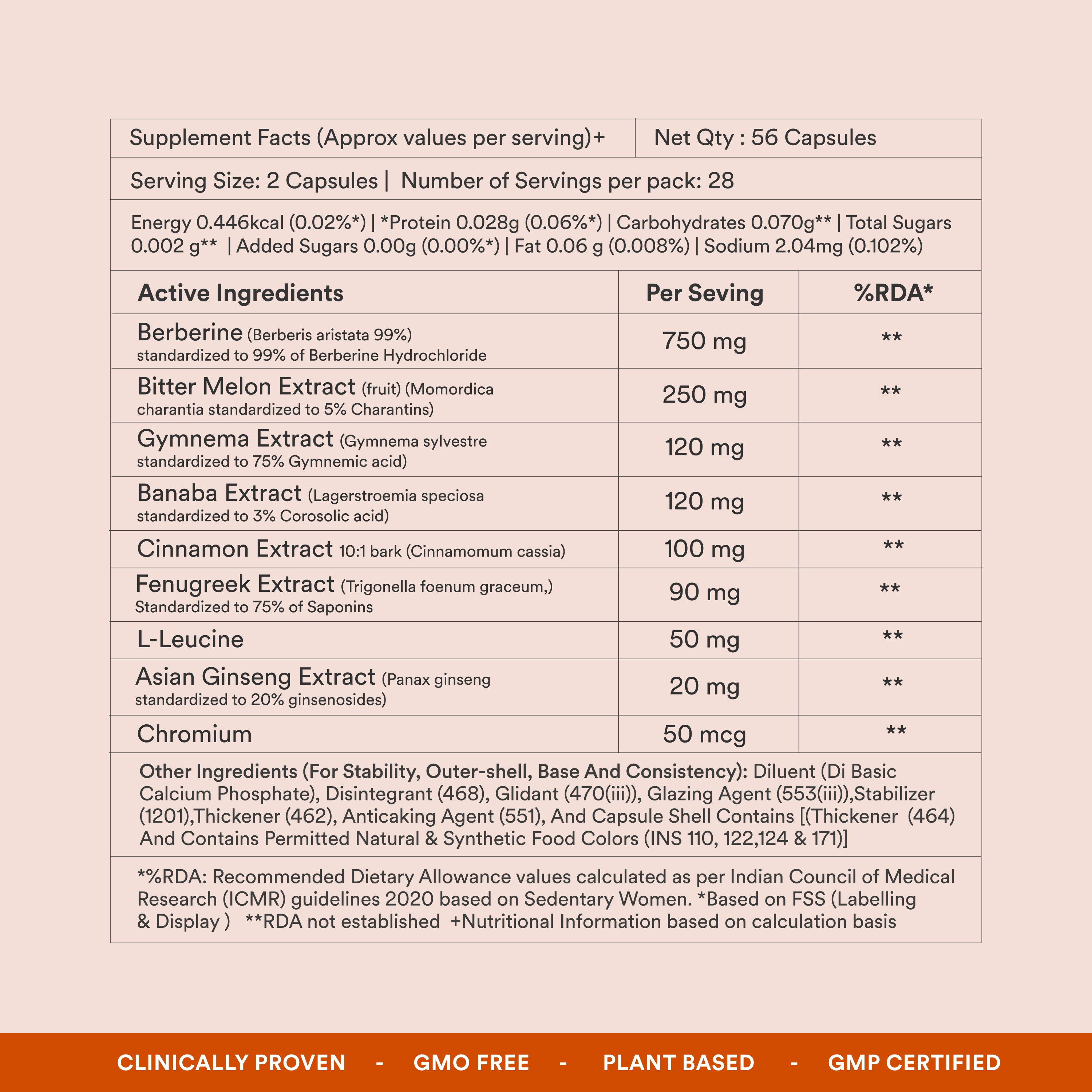 It includes 9 ingredients—Berberine, Chromium, Cinnamon Extract, Bitter Melon Extract, Fenugreek, Banaba Extract, L-Leucine, Gymnema Extract, and Asian Ginseng Extract—that work together to support healthy blood sugar levels.