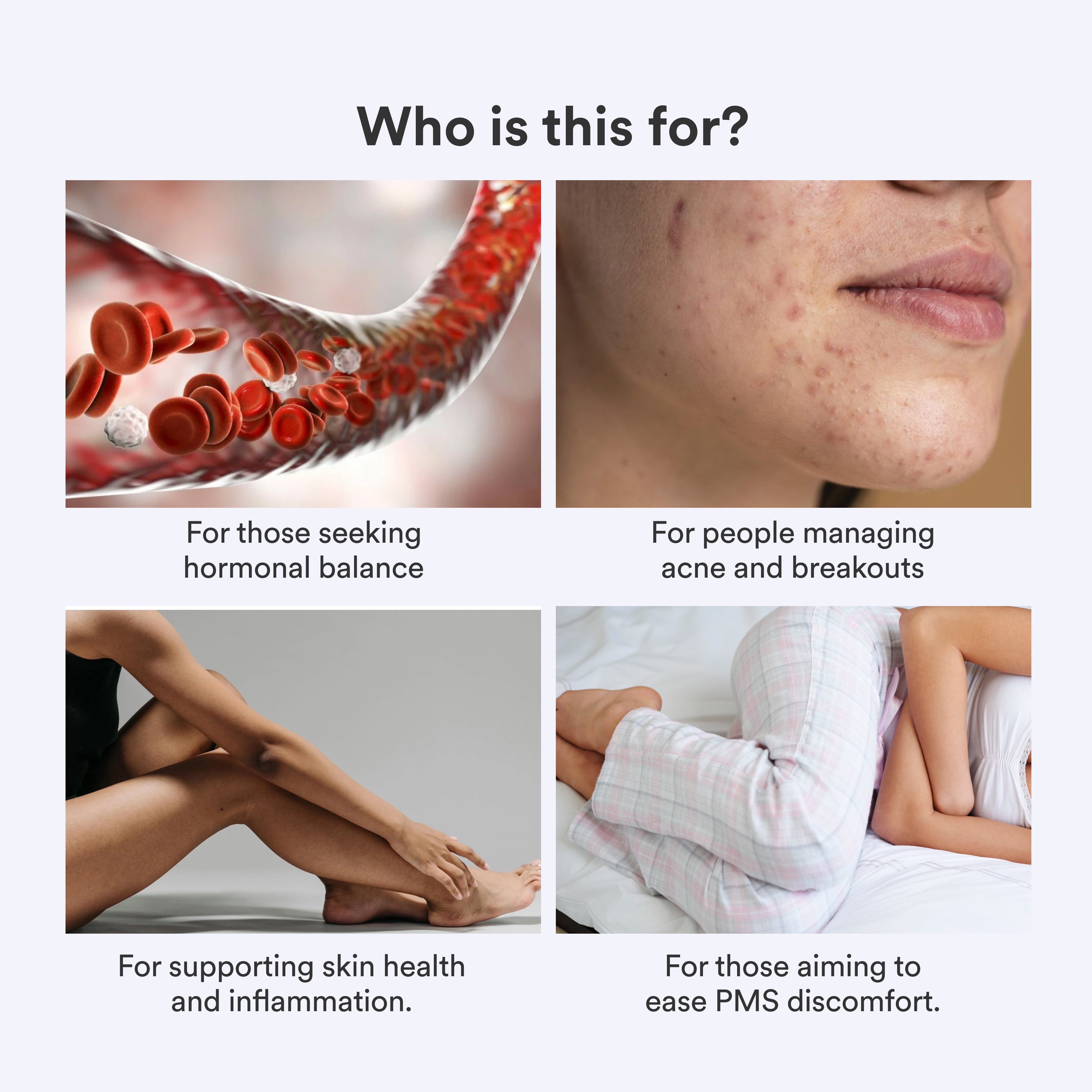 Each soft gel capsule is thoughtfully crafted to support hormonal balance, ease PMS symptoms, and enhance skin health while promoting overall well-being. Backed by our commitment to quality and purity, this supplement provides the nourishment your body needs to thrive from within.