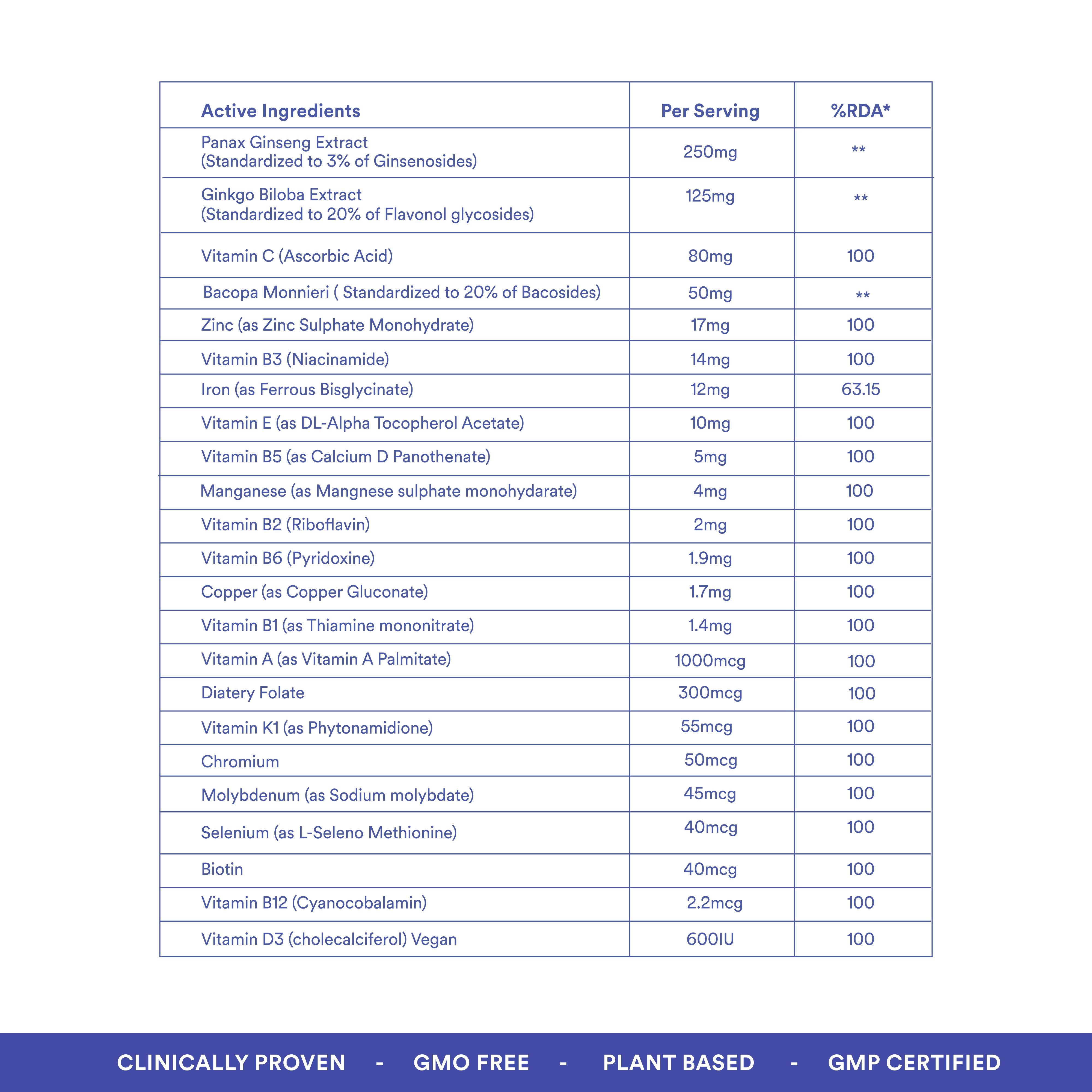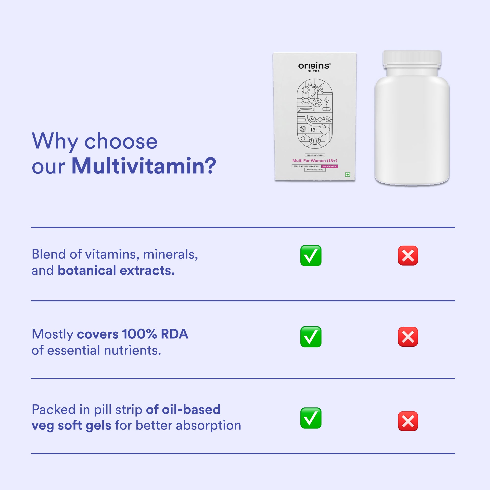 We’ve designed this multi just for men aged 18 to 40, with the right balance of essential nutrients and botanical extracts. It provides nearly 100% RDA for key vitamins, with no conflicting ingredients and complete transparency.