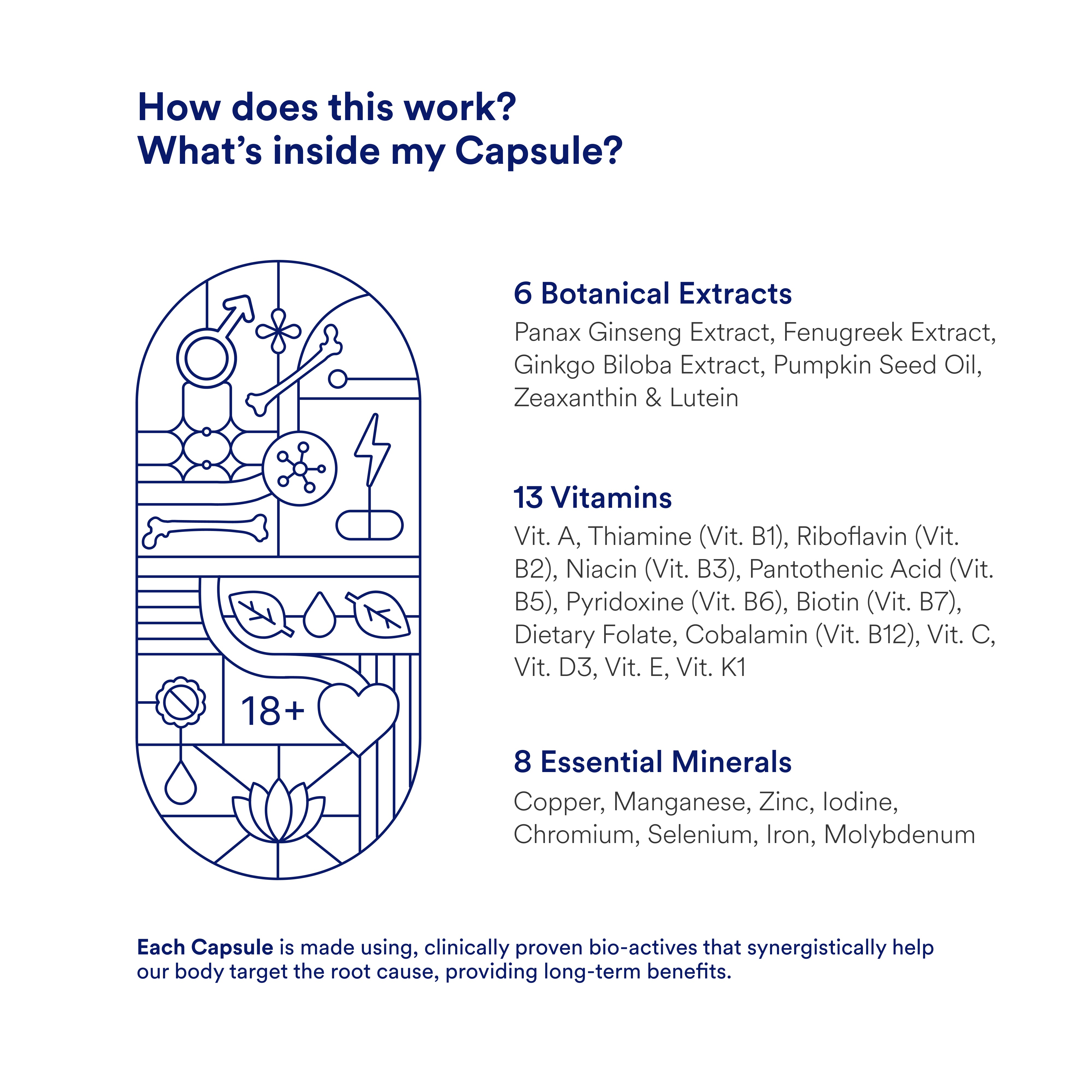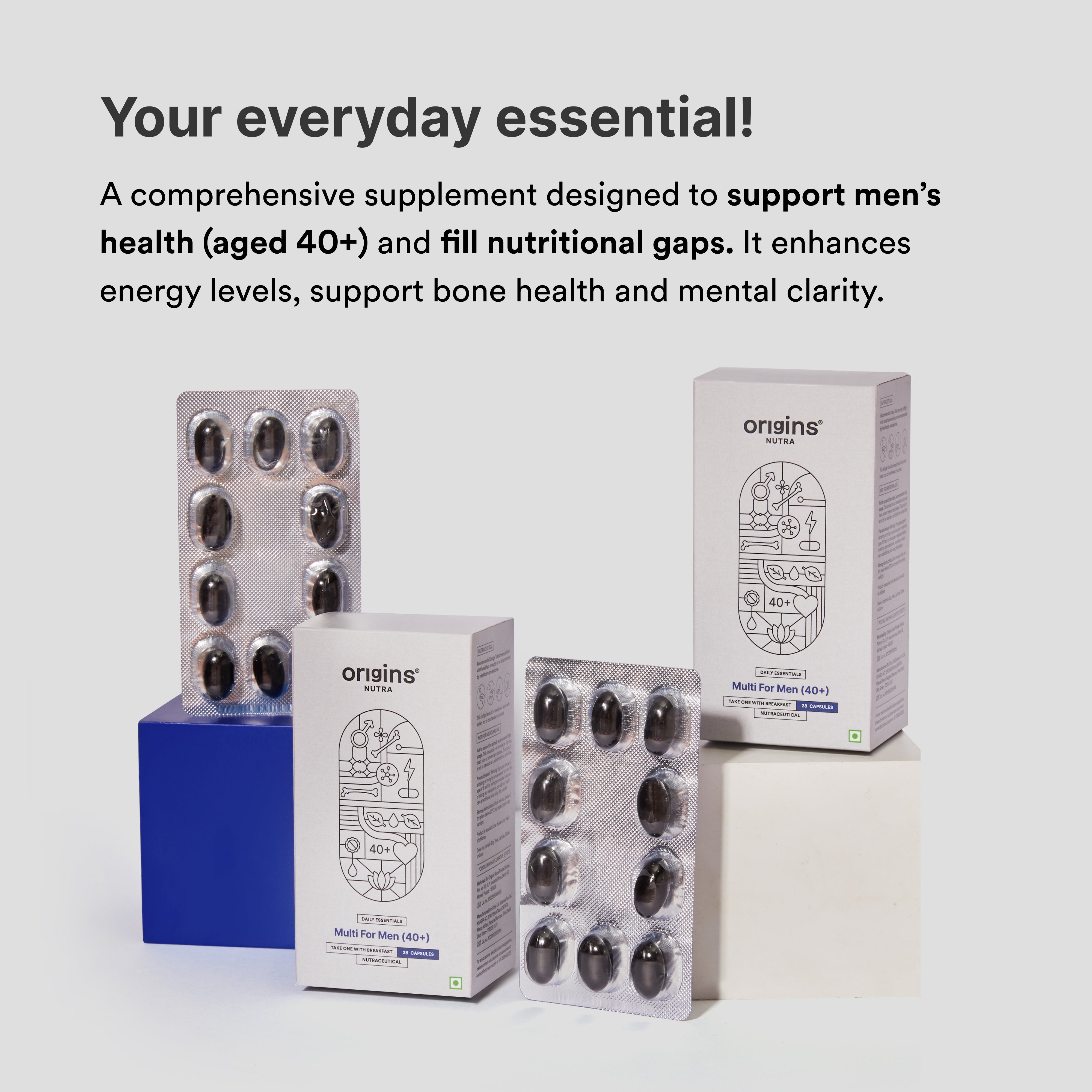 We’ve designed this multi just for men aged 40+, with the right balance of essential nutrients and botanical extracts. It provides nearly 100% RDA for key vitamins, with no conflicting ingredients and complete transparency.