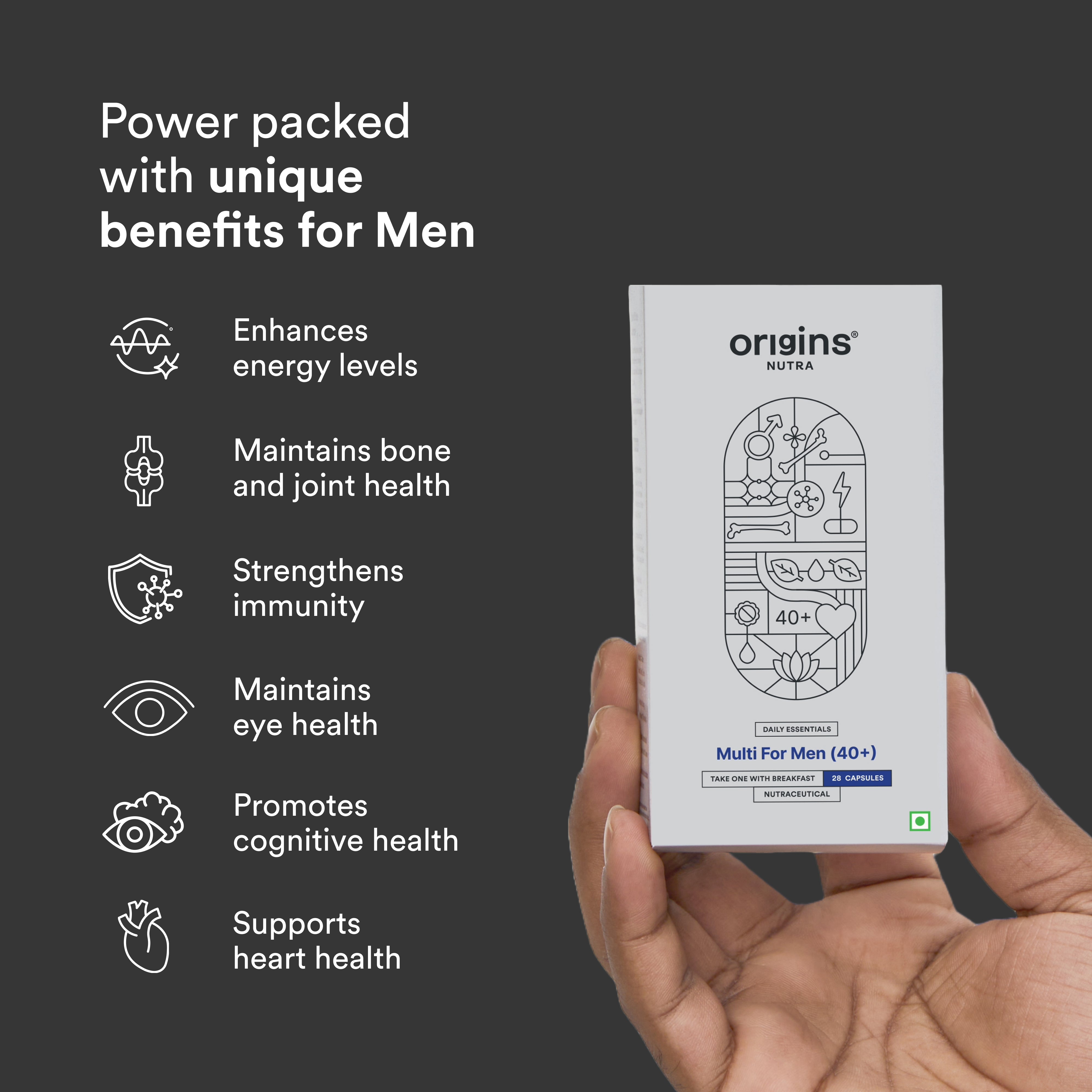 Origins Nutra Multivitamins for Men (40+) is a comprehensive supplement designed to support men’s health and address age-related nutritional gaps. Specially tailored for men aged 40 and above, it provides essential nutritional support to boost energy levels, support bone health and mental clarity.