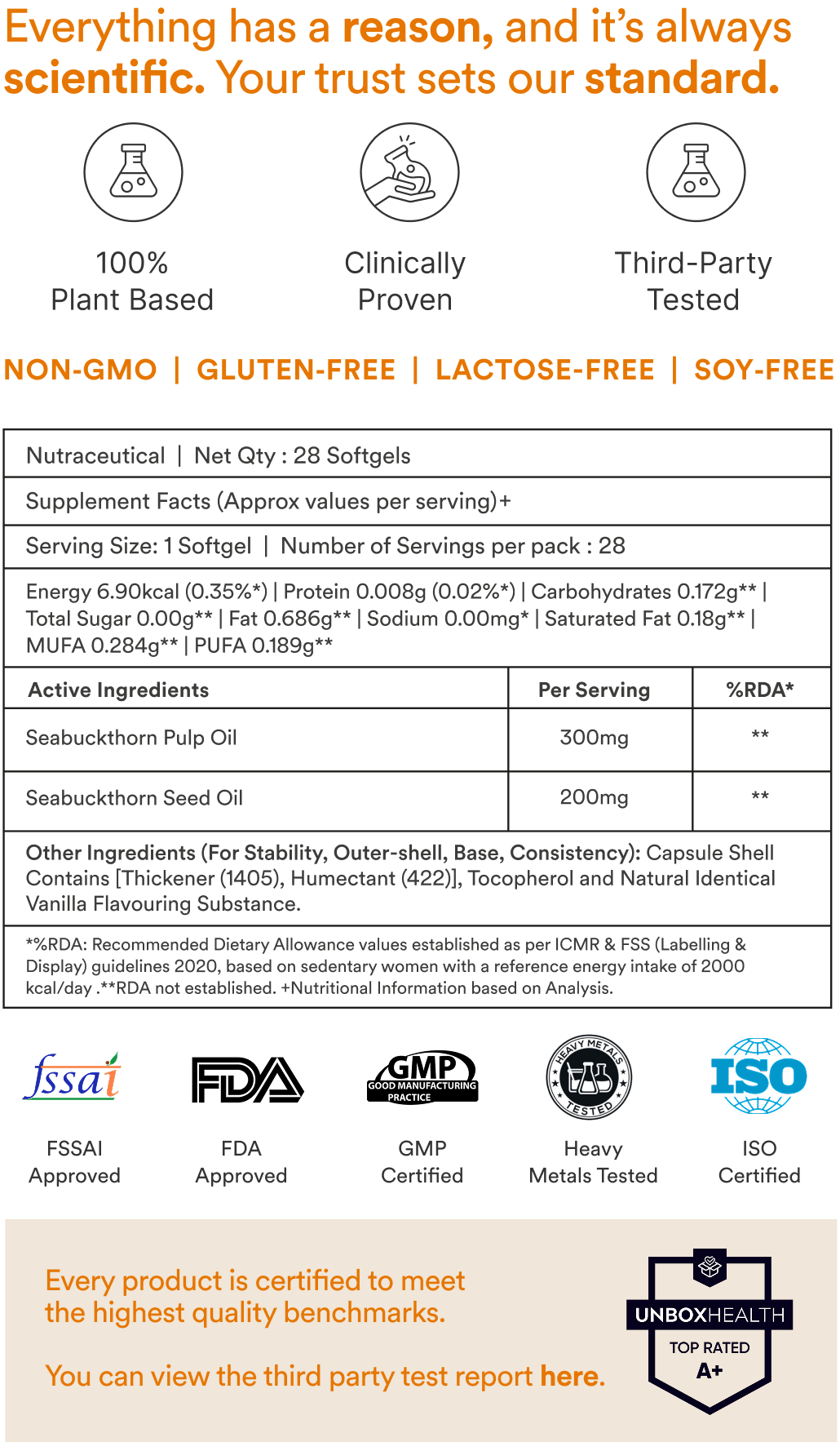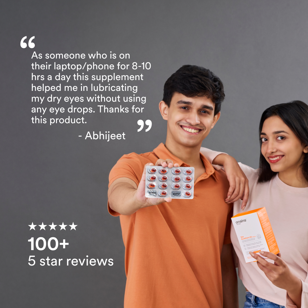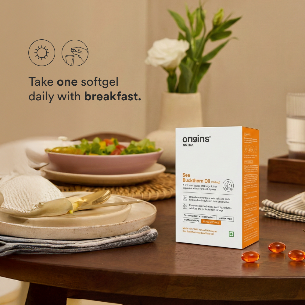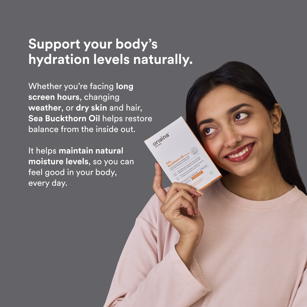 Sea Buckthorn oil is rich in Omega-3, 6, 7, and 9 fatty acids and vitamins, supporting skin hydration, eye comfort, and overall nourishment.