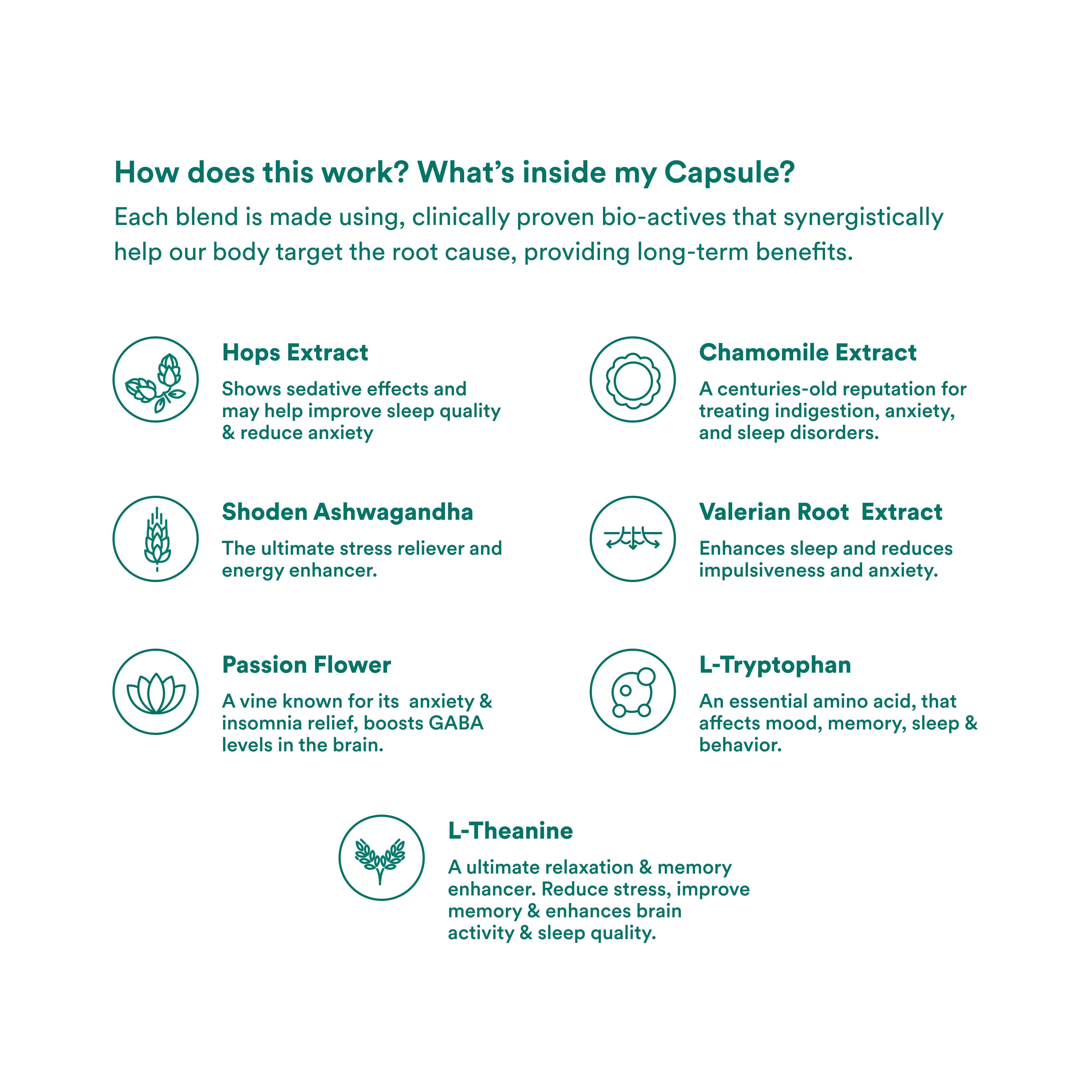 • A unique blend of 7 carefully selected ingredients works together to promote deep relaxation, manage stress, and support a restful night's sleep.