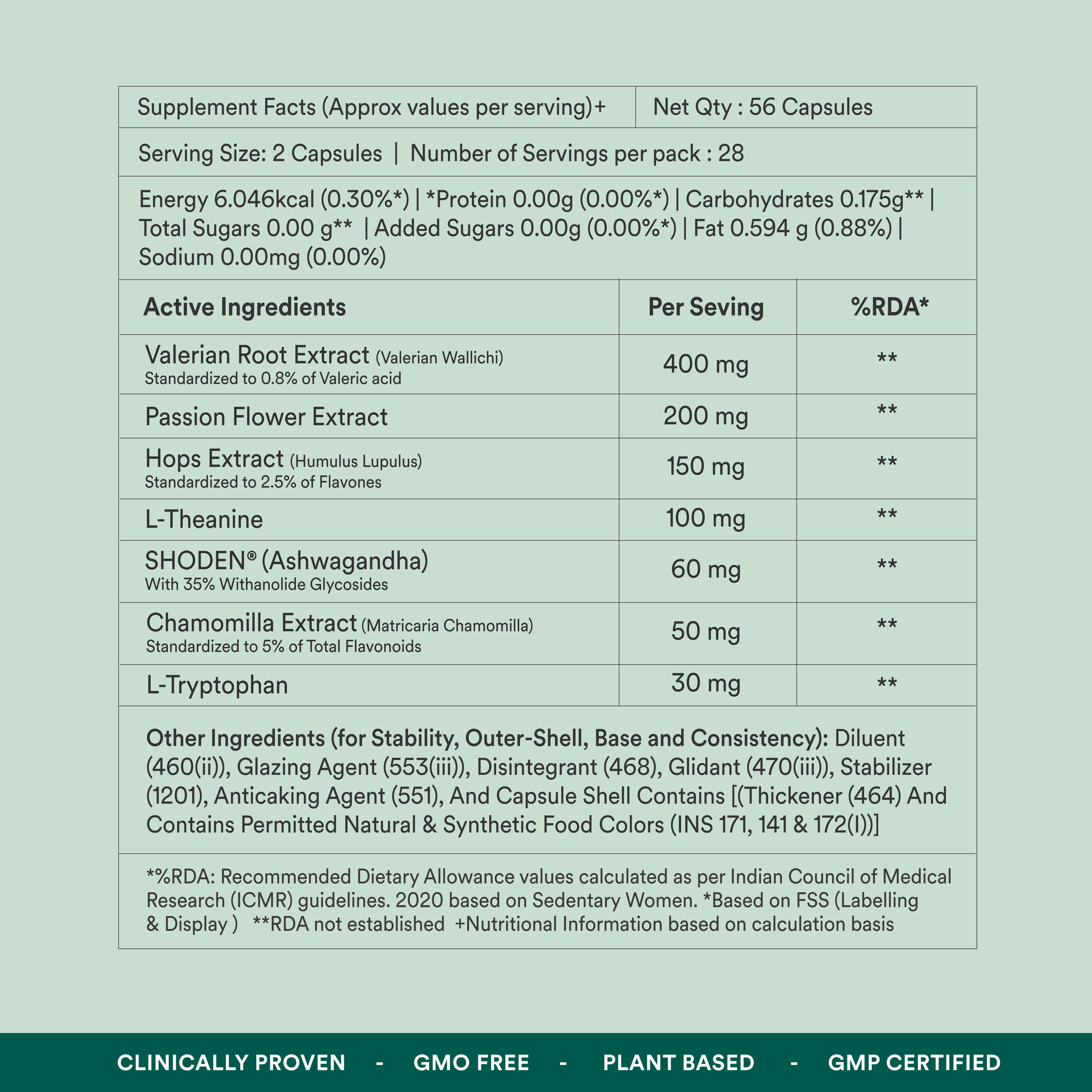 • Shoden® Ashwagandha balances cortisol levels, reducing stress and anxiety, while Chamomile calms the nervous system, setting the stage for a peaceful sleep.