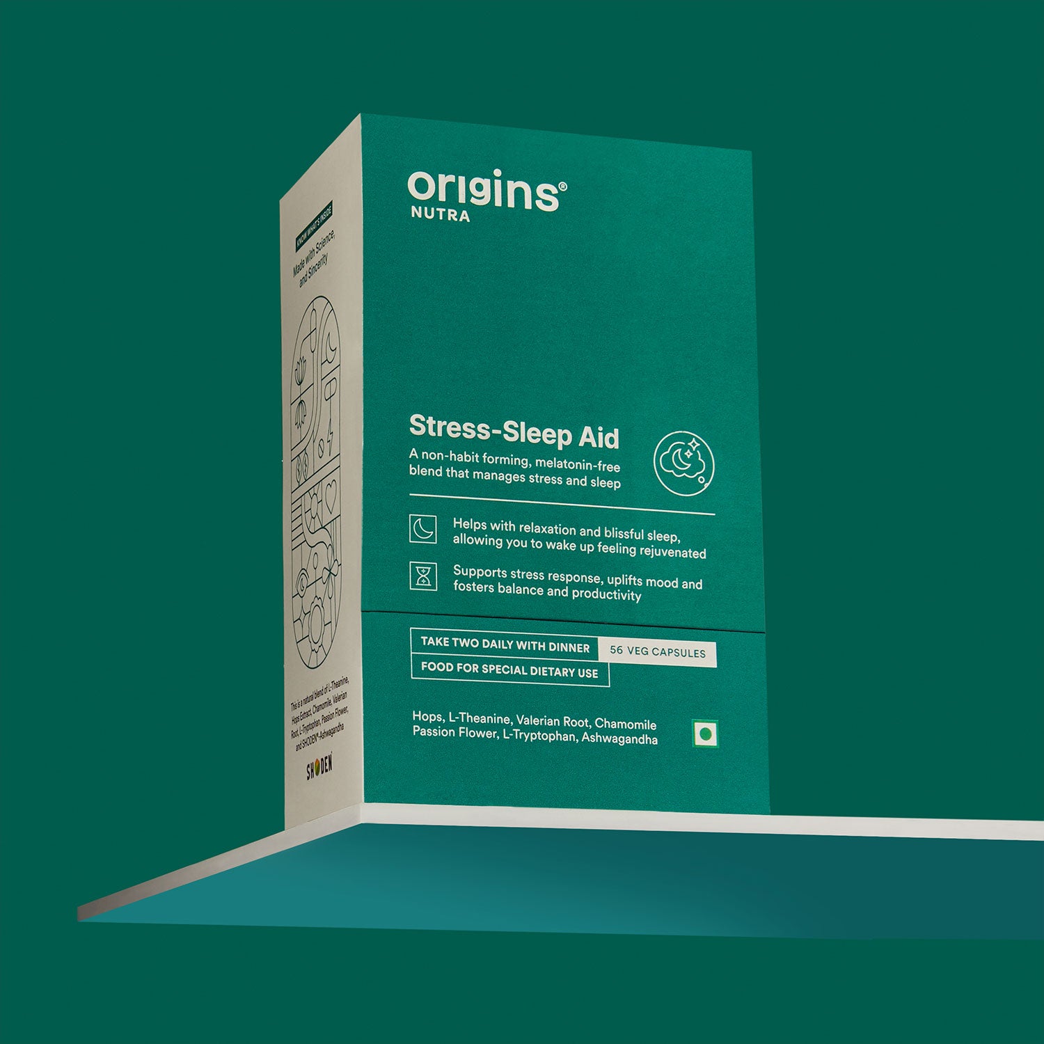 Stress and Sleep Aid by Origins Nutra stands out due to its unique blend of high-quality branded ingredients specifically chosen to promote relaxation, reduce stress, and improve sleep quality. The formulation addresses multiple aspects of sleep and stress management without being habit-forming (melatonin-free) and targets the root cause by encouraging the body to naturally produce melatonin.