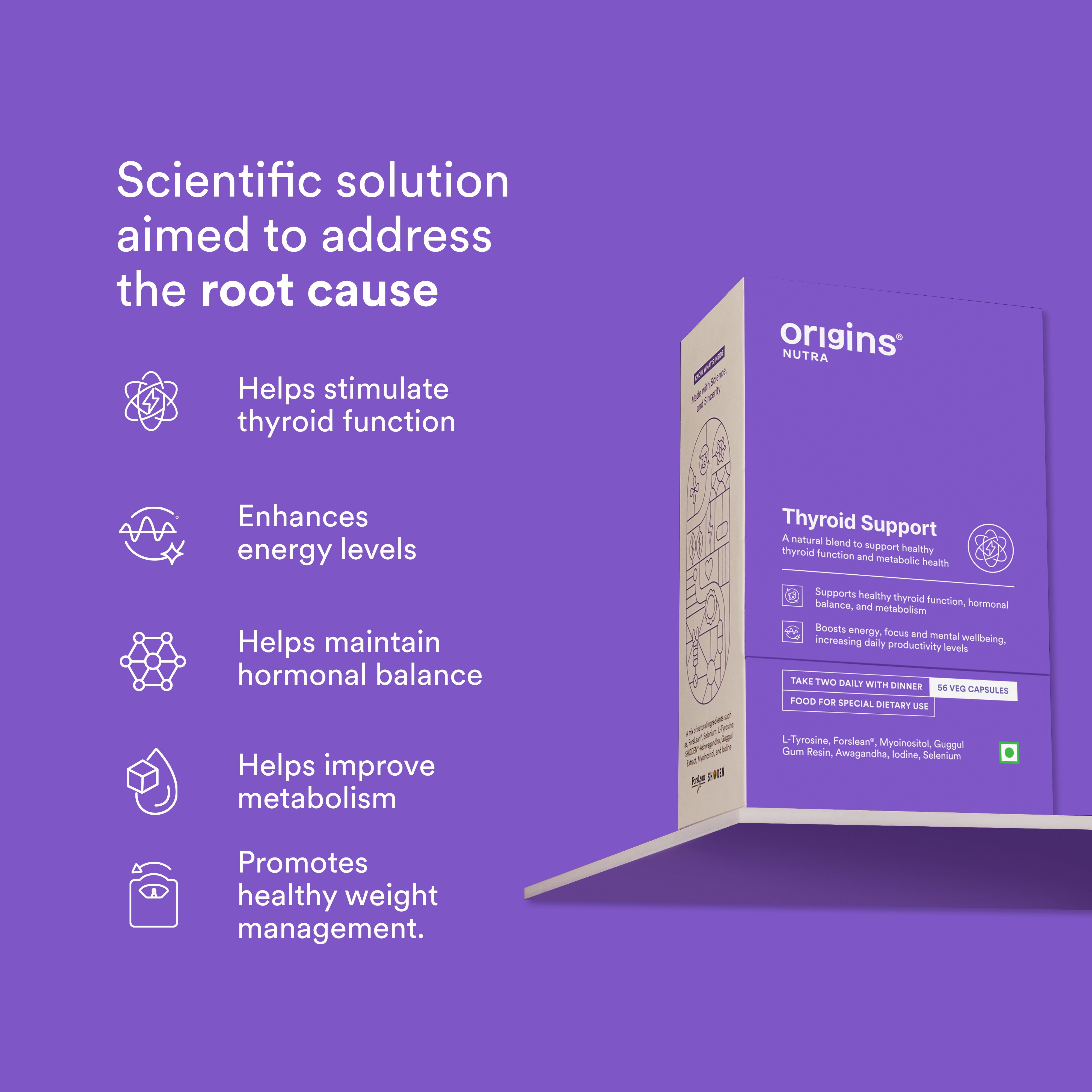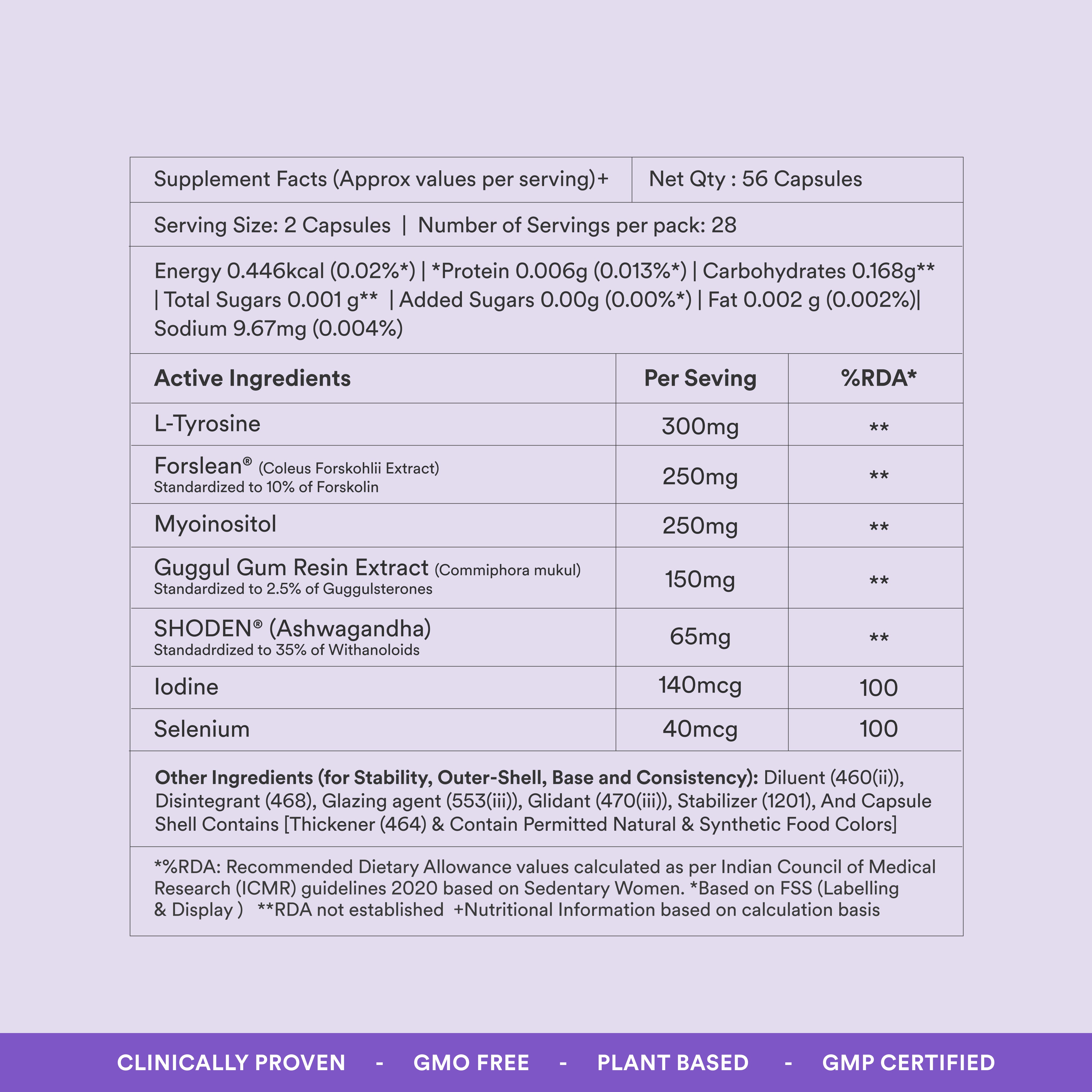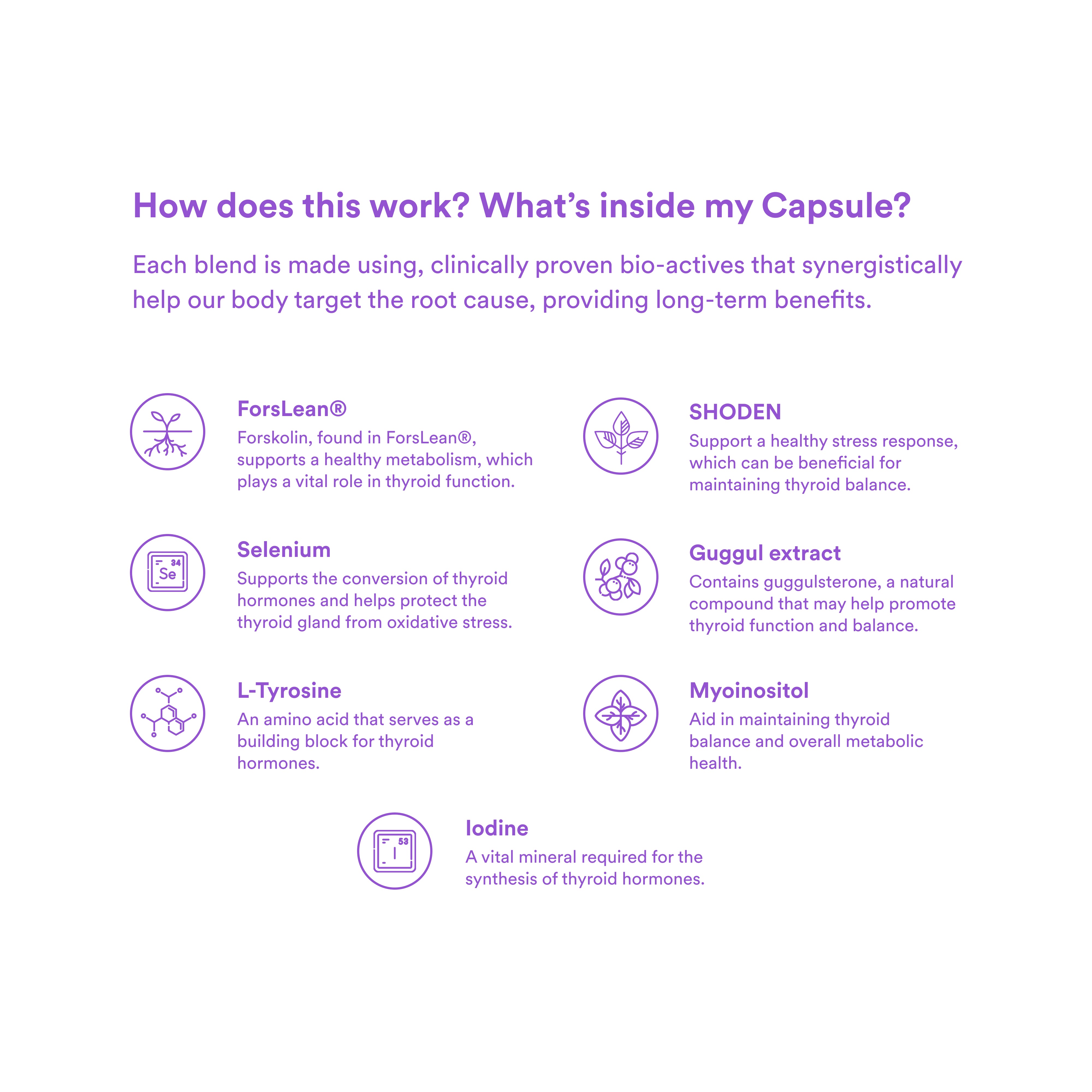 It contains a blend of clinically studied extracts like Shoden® Ashwagandha, Guggul, Forslean®, and four other key ingredients that help maintain healthy thyroid hormone levels, support metabolism, and promote energy balance.